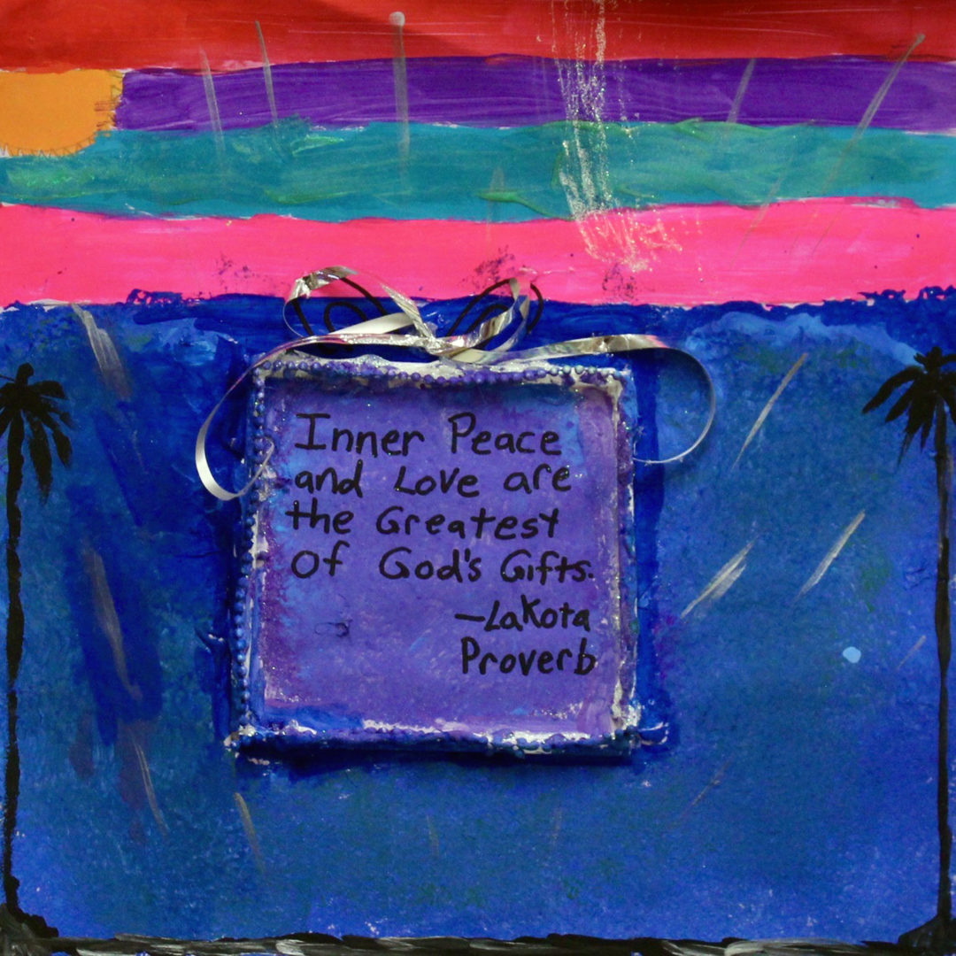 I created a big gift representing God’s greatest gift of love. I also painted two palm trees, a rainbow sunset representing the peace of God.
