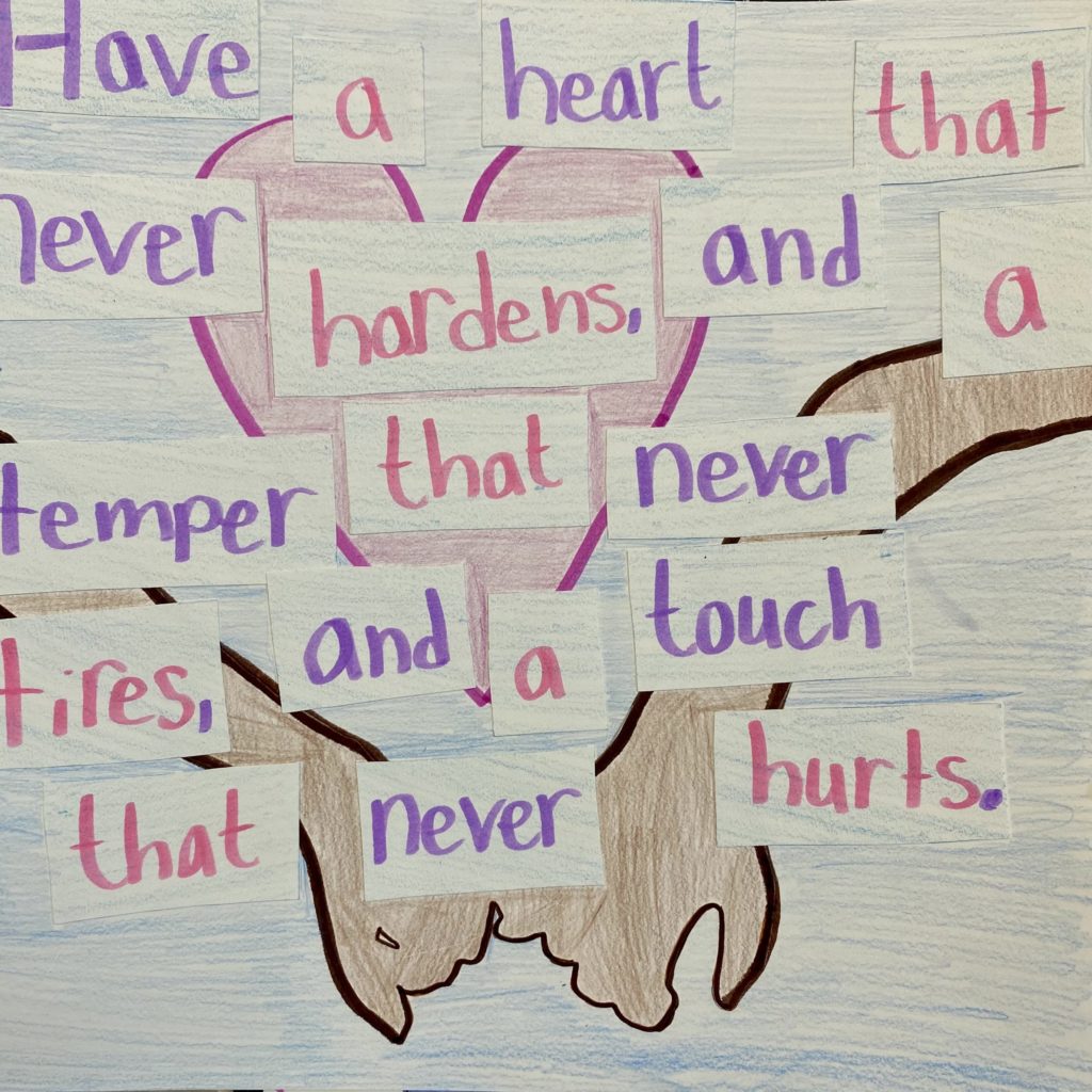 I chose the quote “have a heart that never hardens, a temper that never tires, a touch the never hurts.” This quote made me think of coming together in unity, so I drew two hands touching like a promise. I also drew a heart to symbolize love.