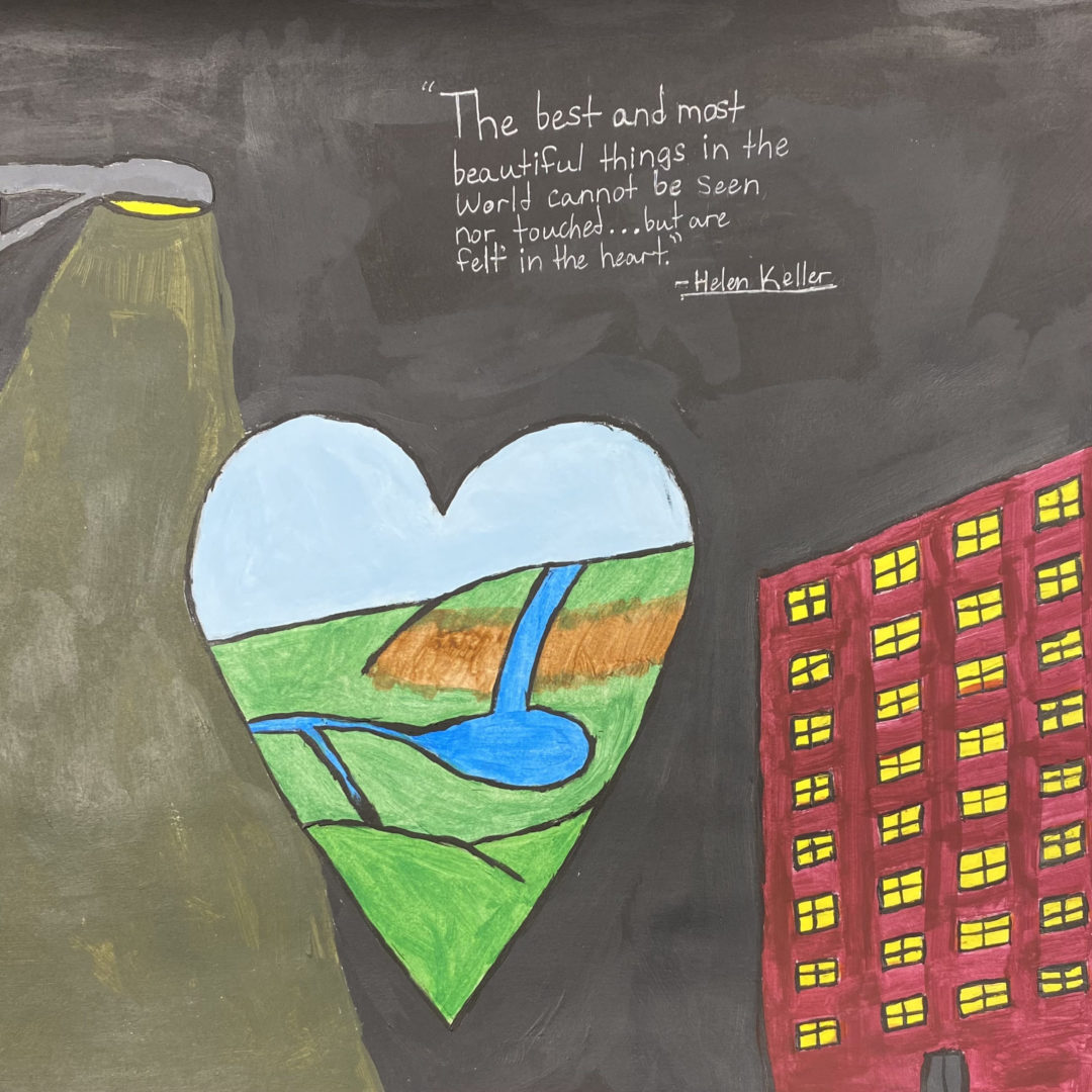 I chose to illustrate this quote by Helen Keller: “The best and most beautiful things in the world cannot be seen nor touched…but are felt in the heart.” I used a lamp post to illuminate the heart, to bring light into a world of darkness.