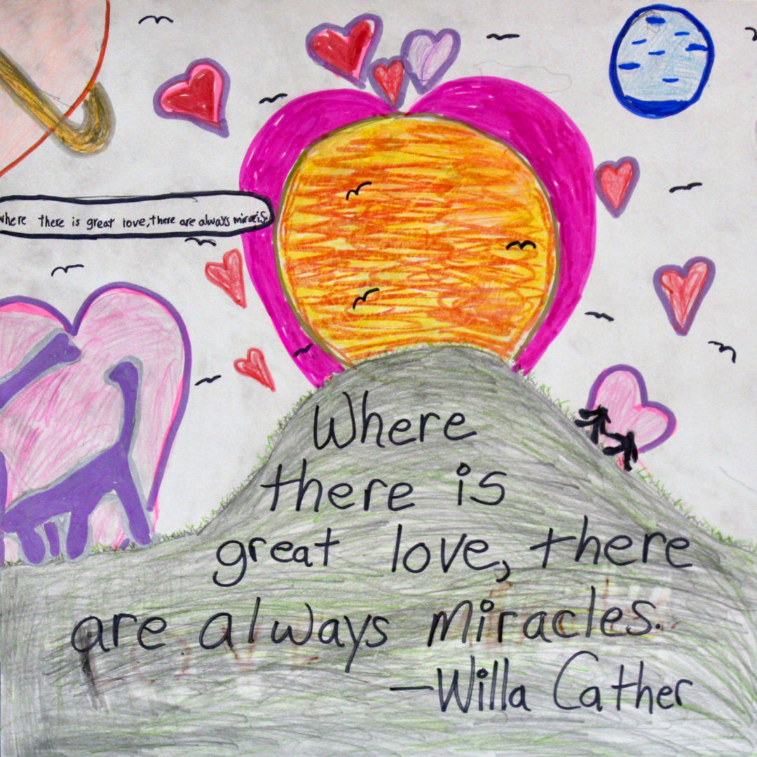 I drew two dinosaurs, two humans, planets, and a big heart around the sun to represent there are miracles where there is love.