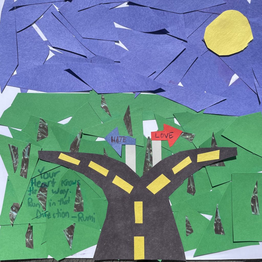 I made a split road with two different paths. I had a quote based by staying on right path. So I did a nice road and mean road. I added some grass, a sky, and a sun.