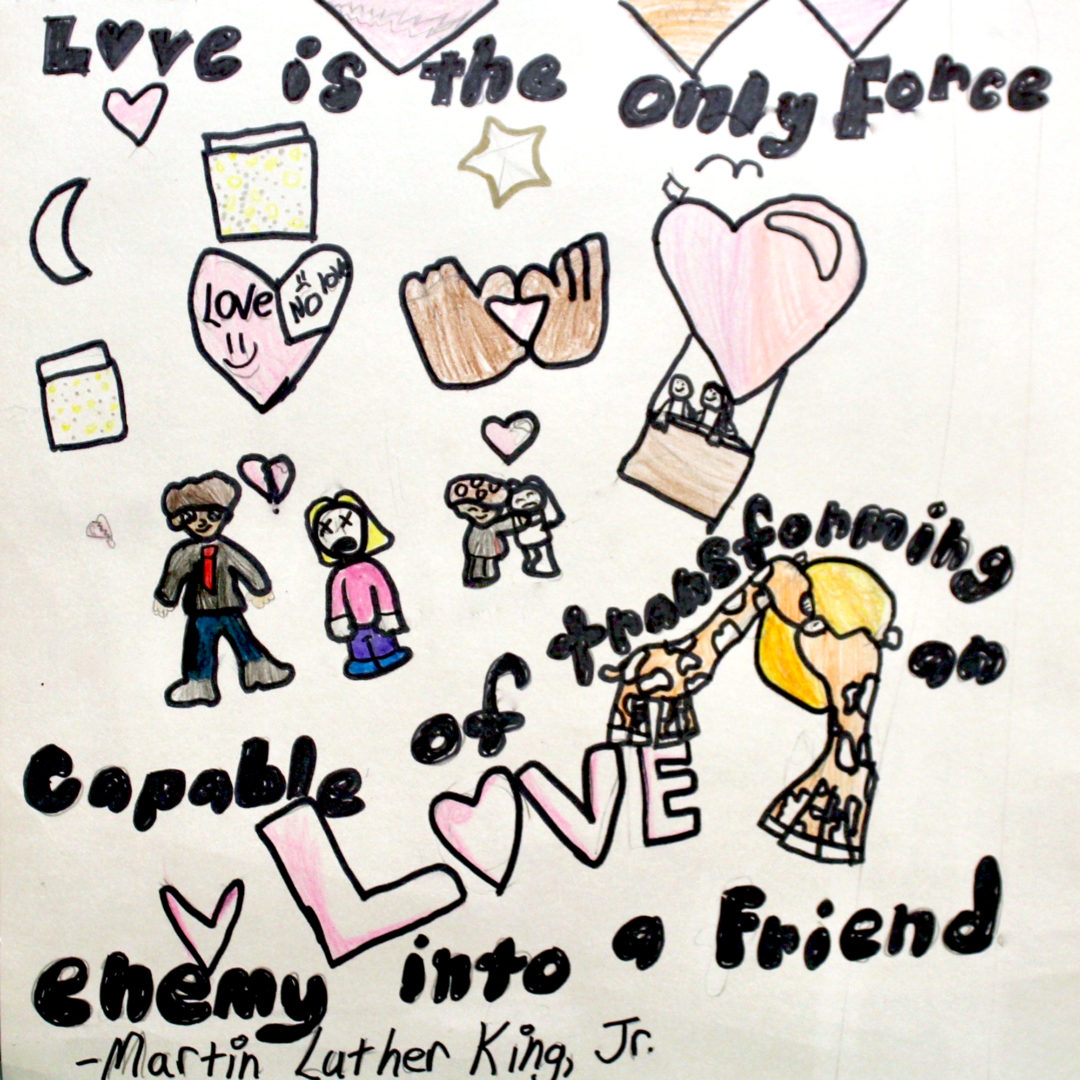 I drew Martin Luther King, Junior because I liked his speech. I also drew and colored hands, heart balloon and two giraffes because they all represent being friends.