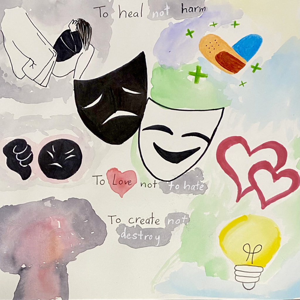 I was inspired to create my artwork based upon the quote “To heal not harm, to love not hate, to create not destroy.” Love unites us and we have the ability to rebuild our community when we come together in the spirit of love.